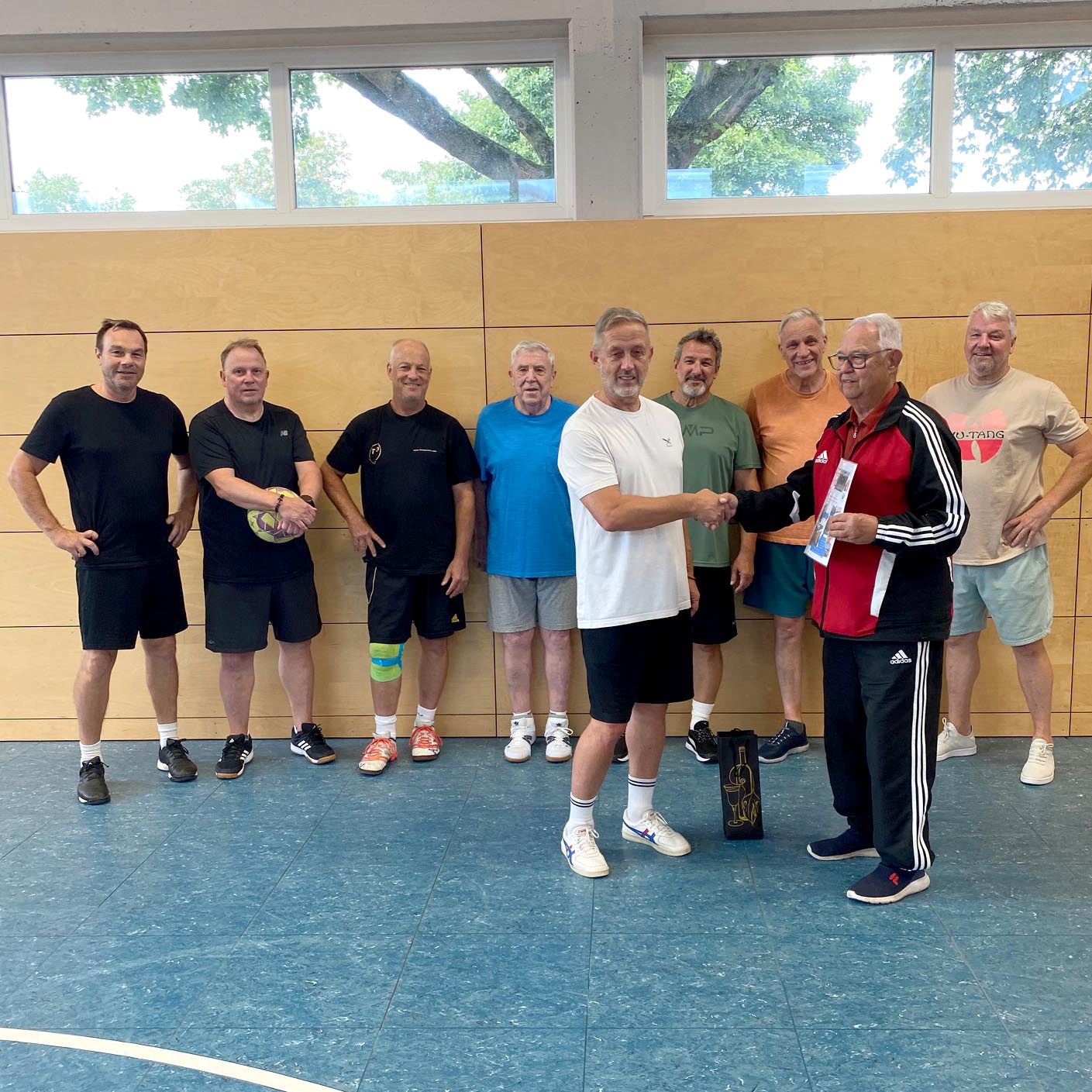 Dies nahm die Fußtennisgruppe zum Anlass, ihrem Sportkameraden am 28. 8. 2025 mit der „üblichen“ Flasche edlen Wein zu gratulieren und alles Gute für die Zukunft zu wünschen. Auf zwei bebilderten Seiten bekam „Grossi“, wie er von seinen Sportkameraden genannt wird, noch einen persönlichen Rückblick überreicht. Angefangen mit der Jugendzeit, wo er als Spielführer der Wormser Jugendfußballkreisauswahl, als Oberligaspieler bei Wormatia Worms und dann als Trainer und Spieler gemeinsam mit Frank Klöter und Markus Heng 2001 mit unserem TuS Hochheim die Meisterschaft der A-Klasse und den Aufstieg in die Bezirksliga erreichte. Weitere Erfolge folgten dann im AH-Bereich.