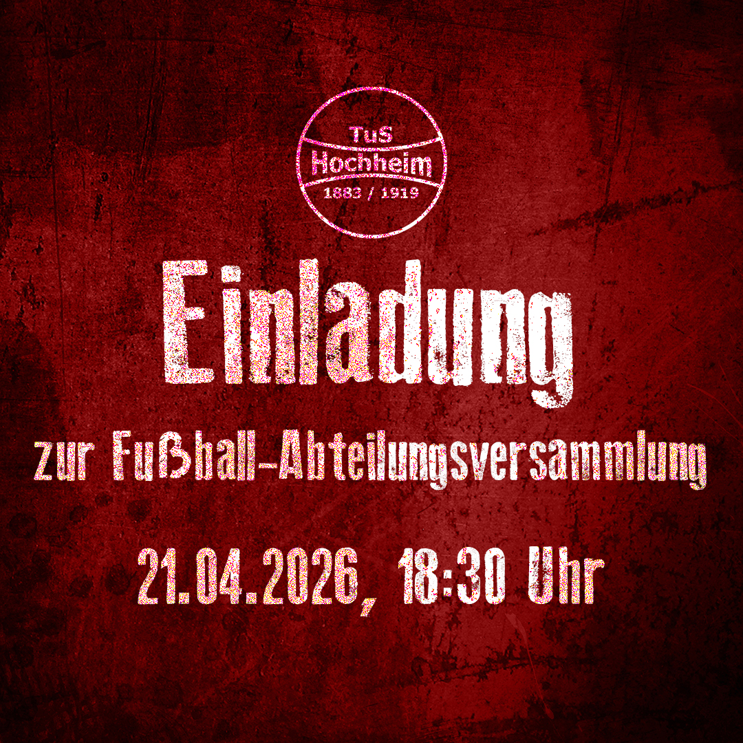 20. April 202620. April 2026 FUSSBALL, TuS Hochheim Fußball-Abteilungsversammlung 21.4.2026 Fußball-Abteilungsversammlung 21.4.2026 18:30 Uhr im Vereinsheim, Nebensaal Begrüßung Bericht der Abteilungsleitung Bericht der Jugendleitung Wahl des Interimsvorsitzenden Neuwahlen Abteilungsleiter Sontiges
