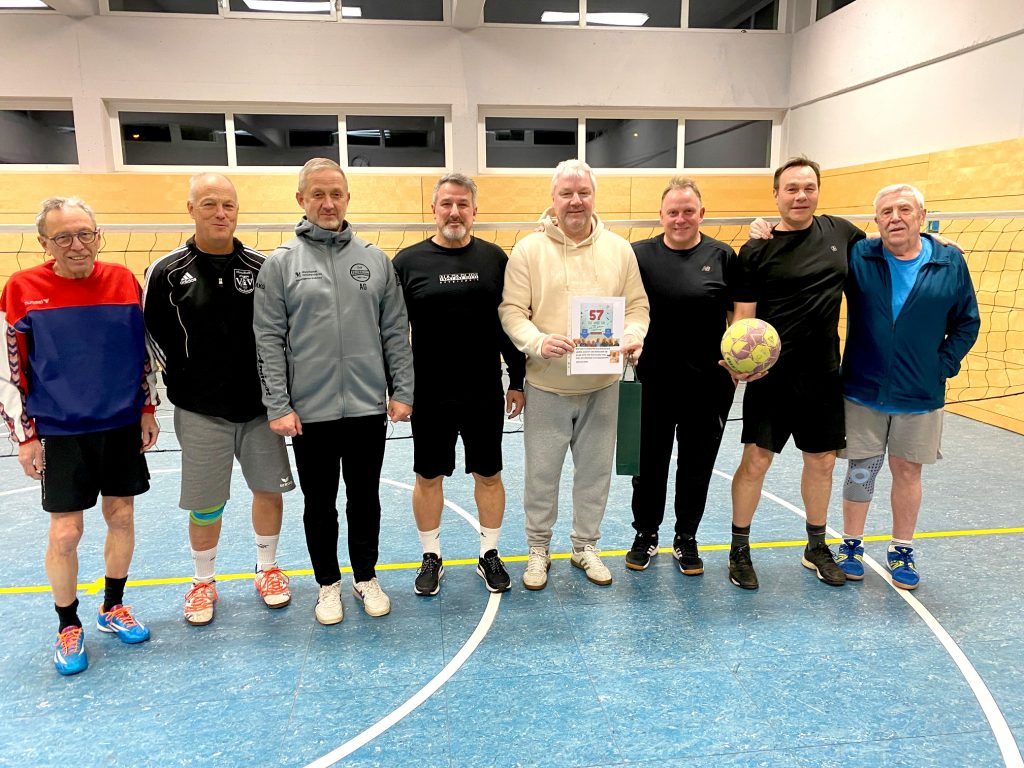 Wieder einmal gab es einen Grund außer interessanten sportlichen Begegnungen in der Halle auch außerhalb der Sportstätte gemütlich noch zu plaudern. Haggi hatte Geburtstag und bekam die Gratulation (s. Bild). Außer einer guten Flasche Wein wurden wieder vom Ehrenvorsitzenden Erinnerungsbildchen mit „netten Bemerkungen“ überreicht. Haggi „revanchierte“ sich mit „Superbrötchen“ und einem Bierchen.
