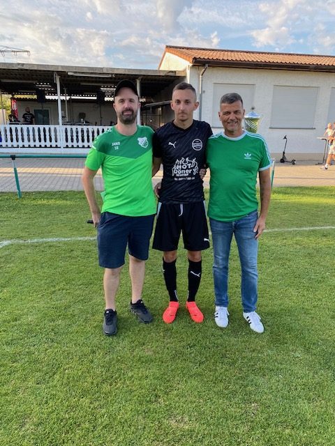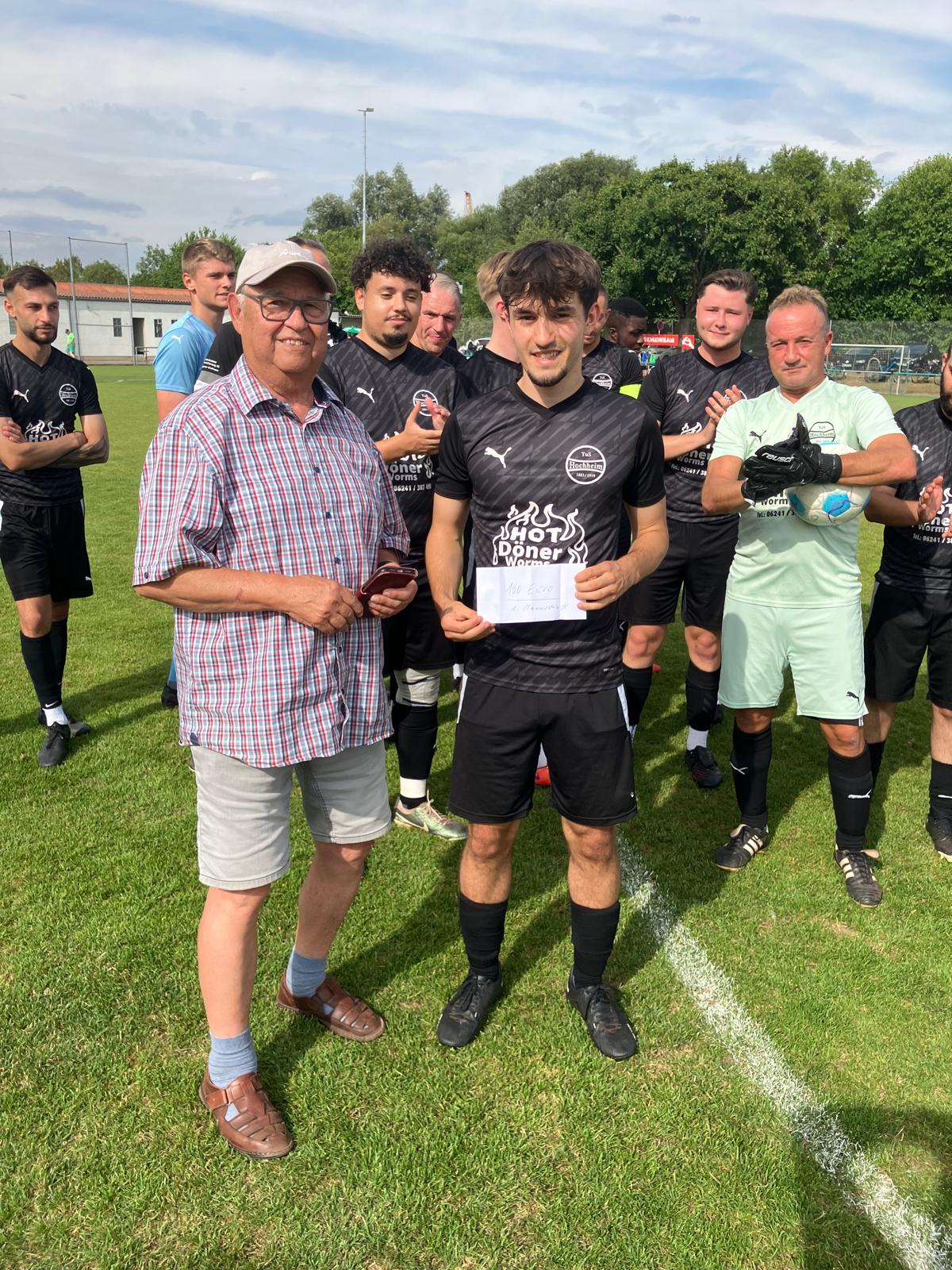 Ehrenvorsitzender Rauh überreicht auf dem Bild dem „Schatzmeister“ der 1. Mannschaft Jan König eine kleine Belohnung für die Erreichung des Endspieles. Auch die Abteilung mit Abteilungsleiter Andreas Großmann würdigte die Superleistung mit einem Gutschein für einen Umtrunk und Pizza.